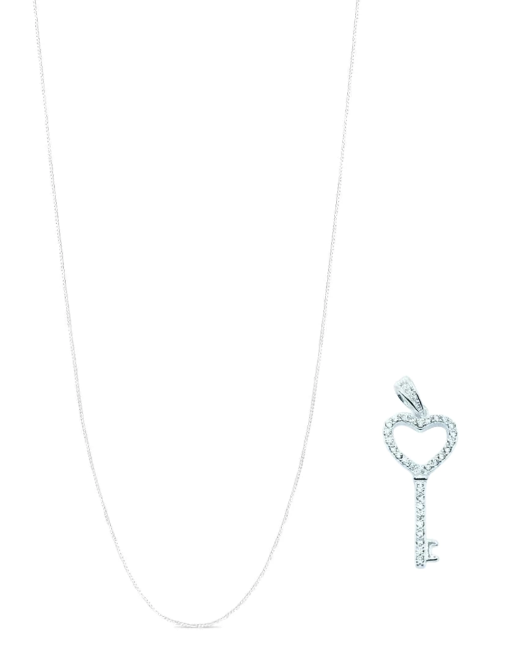 Colar feminino em prata 925, com corrente veneziana V12 de 45cm e pingente em formato de chave com coração. O pingente é lapidado e cravejado, trazendo brilho e delicadeza na medida certa.
